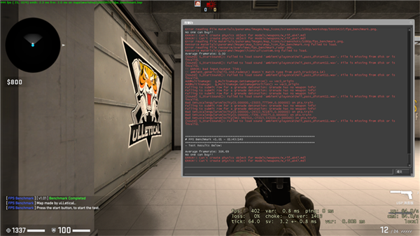 在《CS:GO》中,因为这类游戏对画质渲染压力并不大,我们将其开到高画质,给出的平均帧数为306.69 FPS。