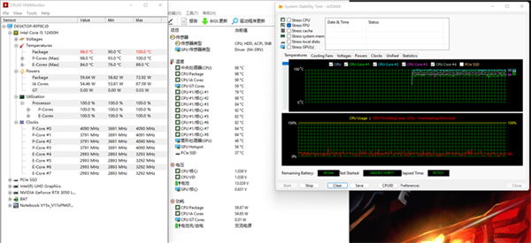 我们使用AIDA64的FPU进行CPU烤机,10分钟后酷睿i5-12450H的功耗在60W左右,P核最大频率为4.1GHz,全核3.8GHz,E核全核频率为3.0 GHz,温度在97-98摄氏度。