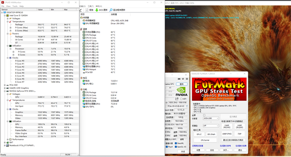 在使用FurMark对RTX 3050 Laptop烤机10分钟后,此时显卡功率在75W,GPU频率平均1522MHz,显存频率6001MHz,温度在70.6摄氏度。