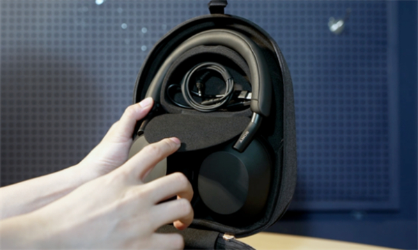 有一点不同的是,这代耳机没办法折叠了,但耳机包看起来要高级了不少,内置的海绵体很好的保护耳机,同时暗仓里还带有耳机线和充电线,十分人性化。