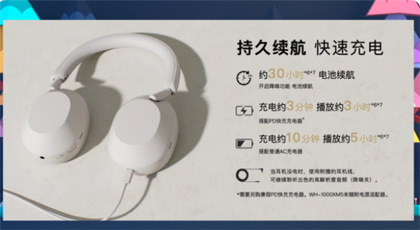 再来说说续航,这次 WH-1000XM5 支持 PD 充电,实测,充电3分钟就能够播放 3个小时,而且拥有长达 30 小时的续航,能够满足一整天的音乐收听,即使是长途旅行也不会有电量焦虑。