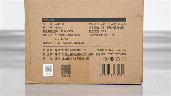 箱子其中一个侧边罗列有台灯的技术参数和制造商信息,下方还贴有防伪标签二维码。