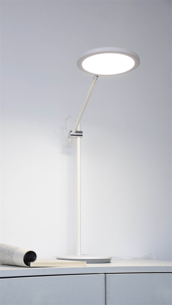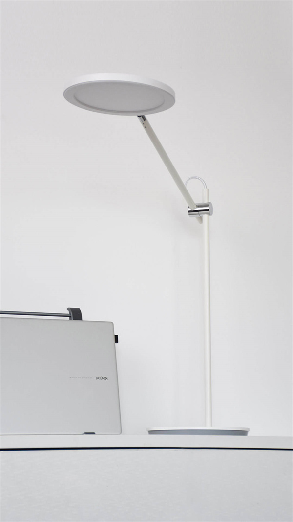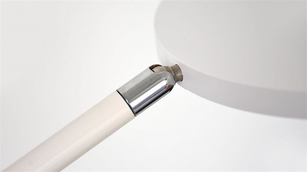 灯臂和灯盘连接处同样设计有可活动的关节,与灯臂处不同,这里采用类似球型云台的结构,通过中间的圆形金属小球实现90度俯仰调节和180度左右旋转调节。台灯完全伸展以后高度可以达到80公分,甚至在平常拍照、直播的时候可以把灯盘对准需要补光的物体或者人脸,当做补光灯使用。