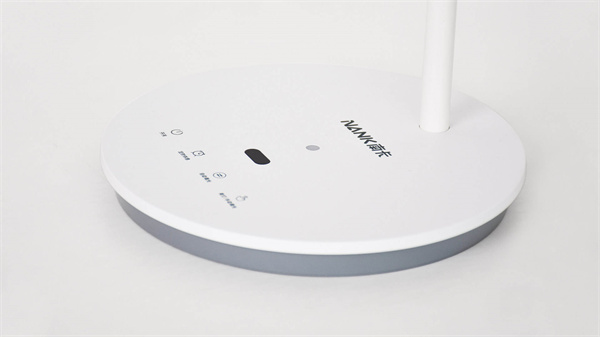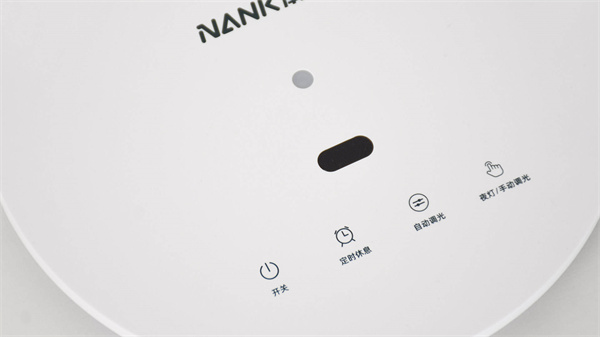 底座正面标记有南卡LOGO,居中的小圆点是光线传感器,腰圆形部分是手势传感器。靠近用户一侧依次分布有四颗触控按键,分别是开关、定时休息、自动调光以及夜灯/手势调光功能键。