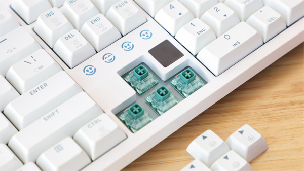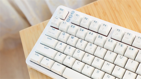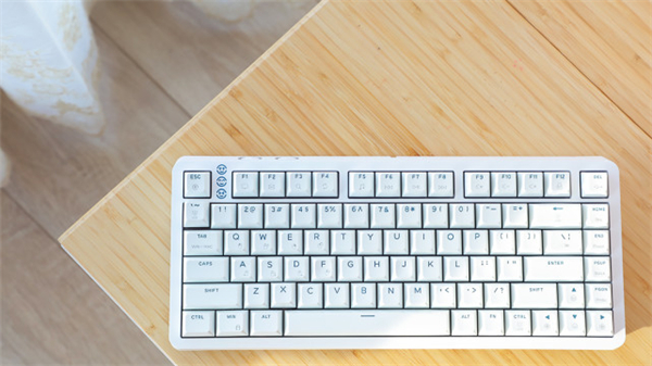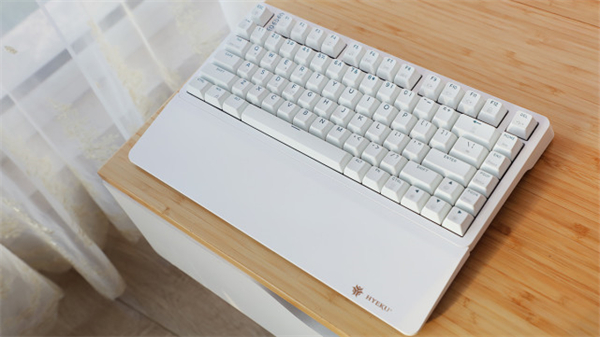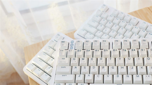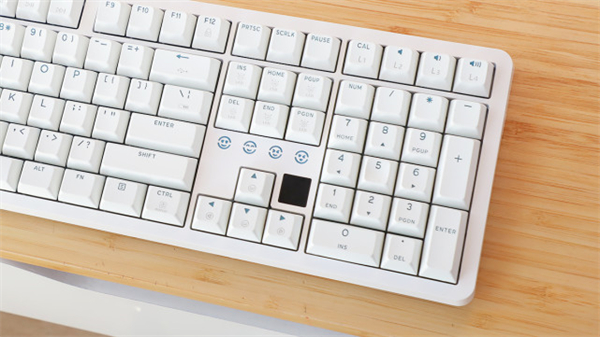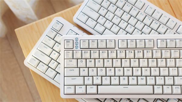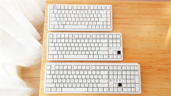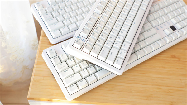 黑峡谷Y系列三模热插拔键盘提供了Y2、Y3、Y5三个不同型号,分别对应82键、87键以及108键三种不同的键位布局方式,也能满足当下用户对于配列、尺寸的不同需求与喜好,考虑还是非常周到的。三款键盘均采用了纯白配色风格,官方命名为洛白,洁白圆润的机身造型搭配键帽上的蓝色字符看起来清新淡雅,简洁清爽,能为用户留下不错的第一印象。机身边框宽窄适中,无论是小尺寸的紧凑式设计,还是标准108配列,线条处理简约干净,让这一系列键盘都能很好地兼具复古元素与现代设计,也更加符合当下用户的审美喜好,还是非常讨好用户眼球的。