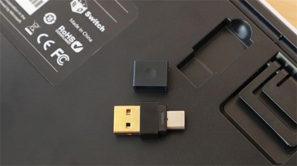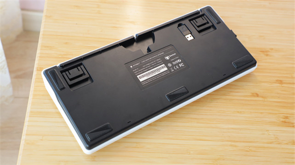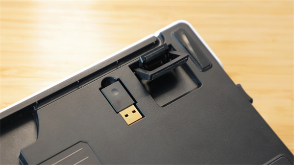 键盘采用了常见的上下壳结构,底壳均为黑色设计,提供了三向出线口、两段式撑脚以及接收器收纳槽。对于有线用户来说,三向出线口可以实现更好的桌面走线、布局,让桌面看起来更加整洁。两段式撑脚可以为用户提供更多的角度选择,让绝大部分用户都能找到最为舒适的使用倾角。接收器采用了双接口设计,提供了USB-A、USB-C两种接口类型,方便适配不同的设备、接口,收纳槽也让用户可以更加轻松的放置接收器,避免丢失。键盘底部四角还提供了长条的防滑脚垫,可以让键盘在不同材质表面都有着更好的稳固表现,不会产生滑动、位移等情况。