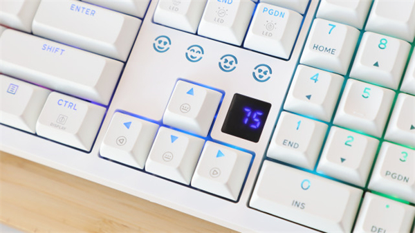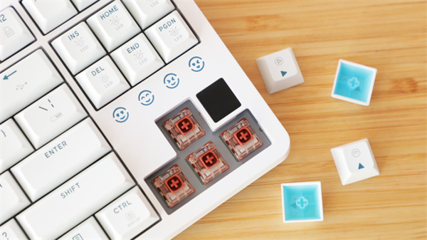 由于Y2采用了小尺寸配列紧凑式布局,所以将状态指示灯移到了左上角位置,三枚状态指示灯采用笑脸造型设计,在辨识度、实用性上都有不错表现。而Y3、Y5两款键盘将指示灯均设计在方向键区上方,并提供了四枚笑脸设计的状态指示灯,除此以外还加入了数显小屏幕,用于显示电量,让用户可以更加轻松的掌控键盘电量。为了方便用户日常使用,Y系列键盘均提供了组合键位功能,键位上也进行了标识,可以方便用户实现多媒体控制、灯光调节、模拟鼠标操作、调用程序等功能,兼顾了实用性与便利性,表现还是很不错的。