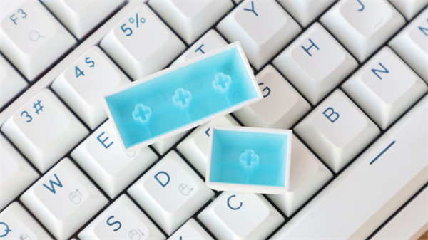 键帽部分搭配了黑峡谷专为Y系列键盘定制的SA高度键帽,它比常规的SA高度要再低一些,坡度也要更大一些,对于指尖的包裹感也更明显。键帽采用PBT材质,双色注塑工艺打造,支持字符透光,采用了浅蓝色内层处理,提升字符清晰度的同时,也为灯光加上了淡蓝色滤镜,在白色背光下尤其明显。键帽字符大小适中,粗细均匀,可以提升开启灯光后的透光表现,不过由于键帽造型与底层用料的问题,字符位置还是有些不够均匀。