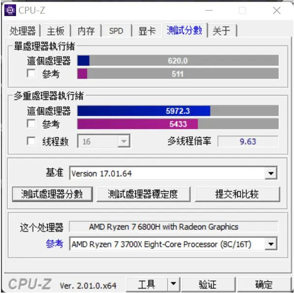 机械革命蛟龙16游戏本采用AMD锐龙7 6800H处理器,在ZEN3+架构和6nm工艺的双重加持下具有8核心16线程的规模,理论TDP 45瓦,但是机械革命解锁到了75瓦。CPU-Z自带的测试程序可以看出,单核心620.0、多核心5972.3、多线程倍率9.63.性能释放出色。