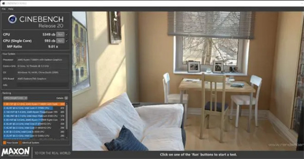 负载更高的CINEBENCH R20.单核心593、多核心5349、多线程倍率9.01x!