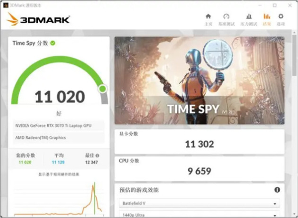 Dx11 1440P分辨率FireStrike Extreme项目,总分13678、显卡14297、处理器24492;Dx12 1440P分辨率TimeSpy,总分11020、显卡11302、处理器9659.