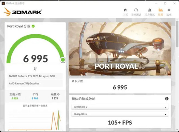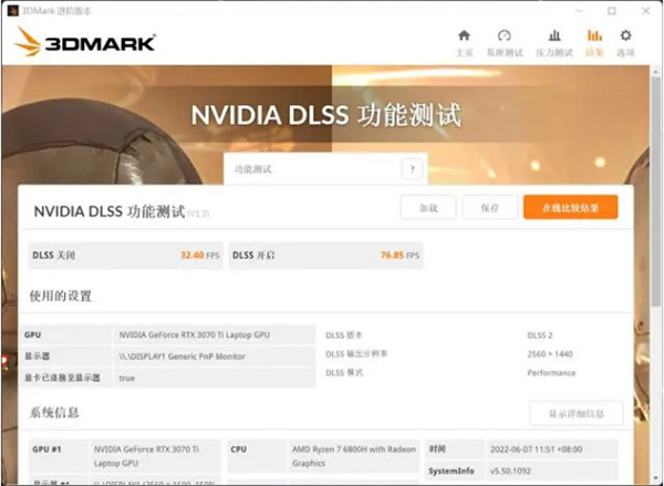 RTX实时光追理论性能的PortRoya项目得分6995分,可见安培架构中第二代的RT Core性能效率确实提高很多。DLSS项目测试使用DLSS 2.0算法,将模式设置为性能,未开启DLSS 32.40FPS,开启后飙升到76.85FPS,流畅度提升不止一倍。