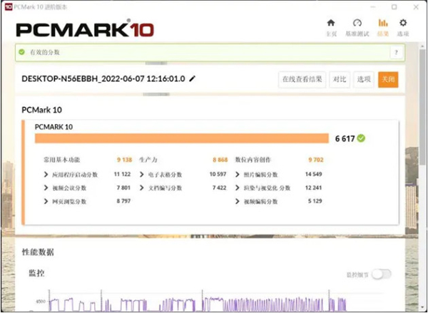 更为严谨的整机测试软件PCMark10.总分6617、常用基本功能9138、生产力8868、数位内容创作分数高达9702分!