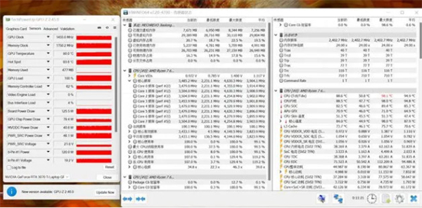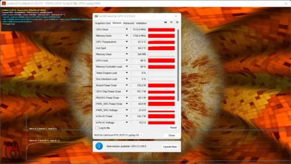 AIDA64 FPU单烤,锐龙7 6800H功耗稳定在75瓦,远超AMD宣称的45瓦,此时全核心频率稳定4.1GHz。Furmark GPU单烤,RTX 3070 Ti 150瓦持续释放,频率高达1515MHz,温度亮眼仅有81.3度。