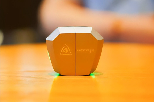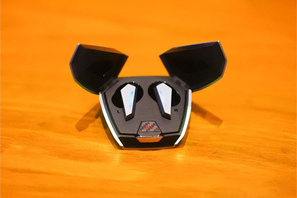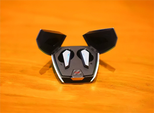 在两侧飞翼门上有光子鸡Logo和HECATE的logo,耳机的背面是Type-C充电接口,打开飞翼门,看见耳机本体,它的设计和耳机仓一样出彩,流线型的设计,再加上背部的灯效,有点赛博朋克那风格了,除此之外,它在连接蓝牙后会呈现出蓝色的灯效显示,非常酷炫。