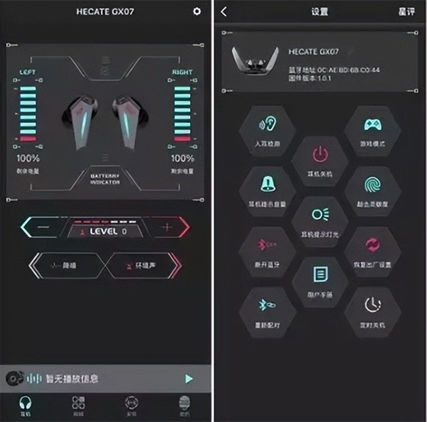 我没想到漫步者竟然为漫步者HECATE GX07联名款也有专属Edifier Connct App,界面UI很有赛博朋克的风格,满满的电竞属性。不仅可以查看耳机电量,还可以进行人耳检测,调节游戏模式、耳机灯光、环境声调节等功能,App功能很丰富。