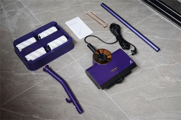 大宇自清洁电动蒸汽拖把除了主机之外,还带有两节手柄、四个滚刷、一个底座和提手,这次我拿到的是星空紫配色。蒸汽拖把的安装比较简单,不用看说明书也能轻松完成。滚刷为超细纤维材质,吸水能力很强,而且能很好的清理瓷砖、地板缝隙内的污渍。