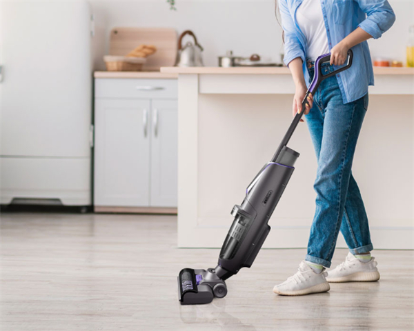 湿拖方面,考虑到不同地板的清洁需求,出水量是可以自己控制的,通过手柄内侧的扳机键可以控制是否喷水。比如清洁木质地板的时候只需出少量的水即可,防止水量过大渗透到地板缝隙造成损坏;清洁厨房等油污比较多的环境时可以持续按下扳机键喷水,清洁力度更大。