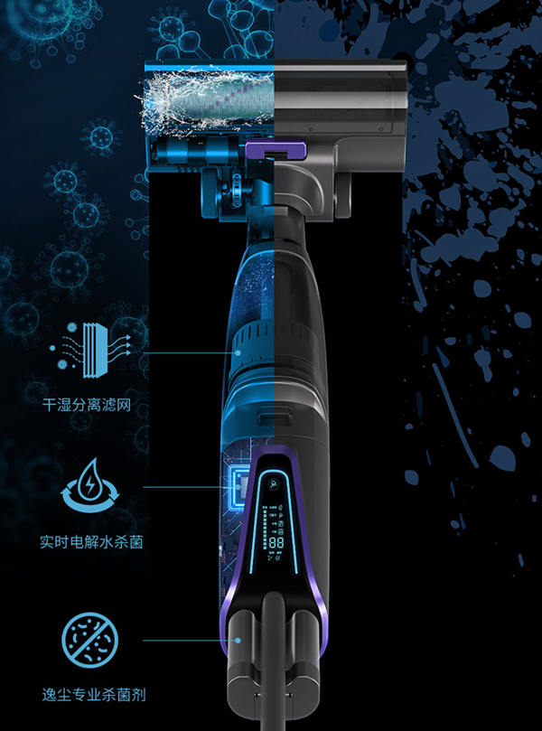 此外,在机身中还加入了电解水芯片,开启湿拖作业的时候通过将自来水电解生成次氯酸水的原理对清水箱中的水起到净化的作用,有些类似于电解果蔬清洗机的意思,与杀菌剂配合,双管齐下实现真正的无菌清洁。