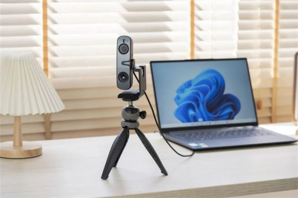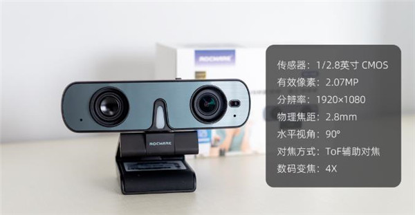 ROCWARE的RC08外表看像是摄像头,而官方将他定义为“音视频一体化摄像机”,正面仿金属拉丝工艺,1080P分辨率摄像头在右侧。下面有一个多功能夹,能很容易夹在屏幕顶部,也能透过标准螺孔和三脚架、桌面支架配合,左侧是一个内置的扬声器,摄像头旁紧挨着ToF对焦传感器和一组麦克风。