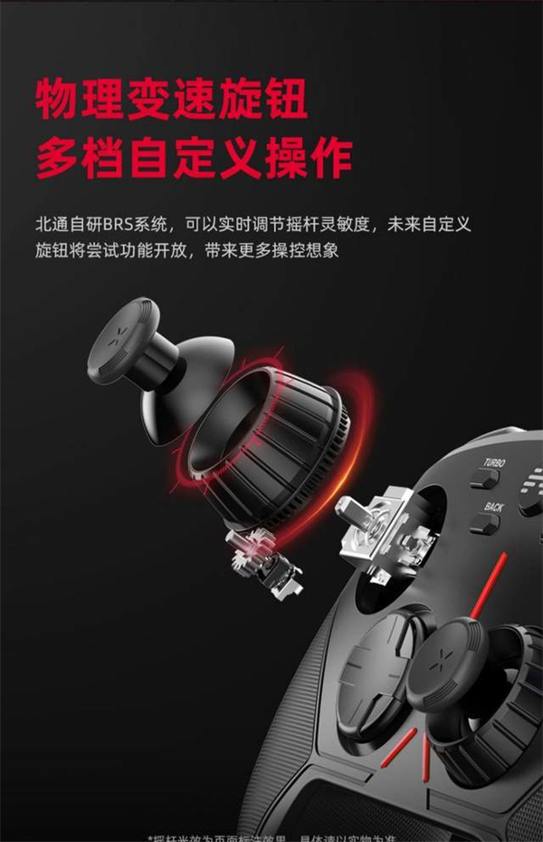 对于游戏手柄来说,仅仅有好看的外观和布局是远远不够的,更重要的是操作上的体验如何。北通阿修罗3S采用宙斯级机械按键,0.7mm的触发行程,大幅缩短触发时间,按键反馈更加灵敏干脆。同时北通阿修罗3S还有物理变速旋钮的设计,简单来说就是可以通过物理变速旋钮调节左右摇杆的灵敏度,以适应不同的游戏场景。