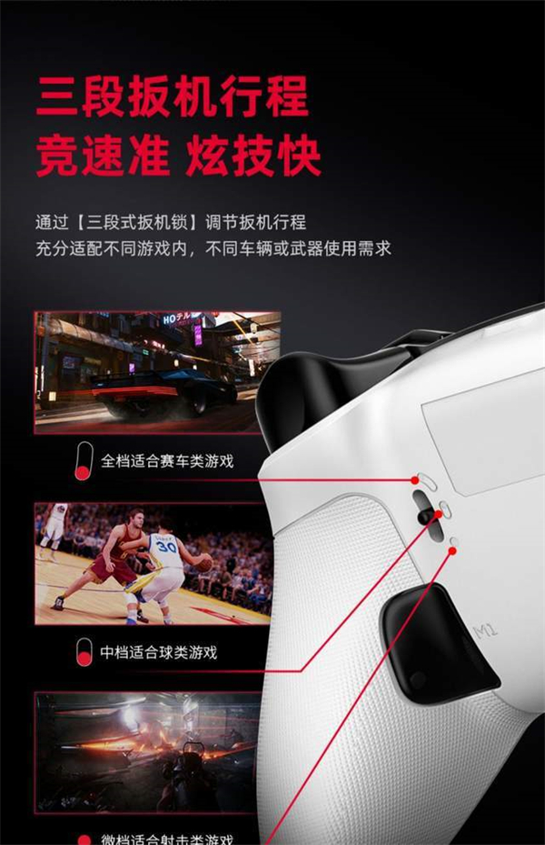北通阿修罗3S还对手柄的扳机做了很大的升级,通过原装进口霍尔扳机以及电磁感应驱动技术,让手柄的扳机反馈更加精准,并且还支持扳机的行程调节,不管是玩吃鸡还是体育比赛类游戏都更加得心应手。另外,十字键也做了不小的改进升级,进一步降低了误触概率,同时还附赠一个圆盘十字键,玩家可以根据自己的喜好自由更换。