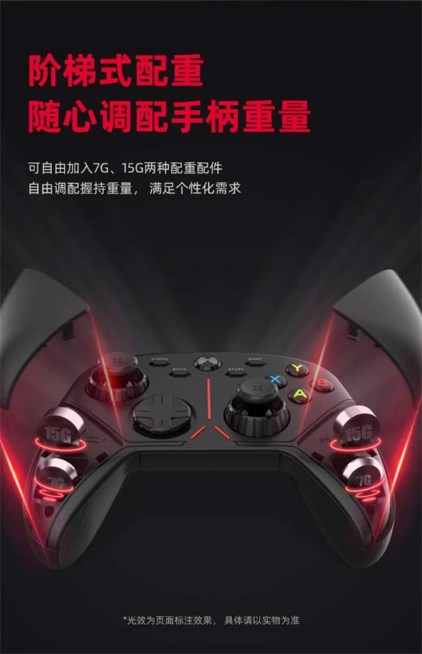 在细节方面,北通阿修罗3S也做得比较到位,在配重上提供了7g和15g两种配种重量,用户可以根据自己的喜欢自行调整,保证游戏手柄的握持体验。而且在手柄背部增加了两个自定义编程背键,实现“六指联动”,让游戏操作更加方便迅速,很大程度上提升了游戏体验。