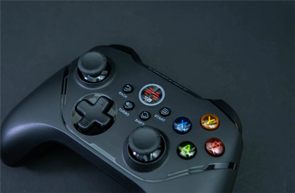 开机键结合到了中间的北通LOGO,轻按即可开启,同时有LED灯亮起,LOGO键前方亮面印有“AUYRA2 PRO”型号字样。面板上最左边是左摇杆和“十”字键,下面是BACK键、TURBO键、SHIFT键、START键。最大的亮点除了红色的LOGO外,ABXY按键的彩色元素同样给产品颜值增色不少。