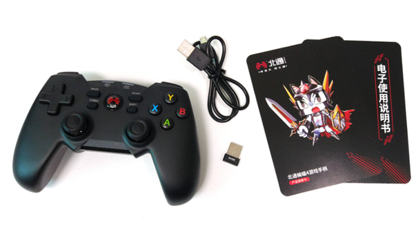 北通蝙蝠4游戏手柄盒内主要有北通蝙蝠4手柄、充电线、说明书*2、2.4GHz无线连接端子。