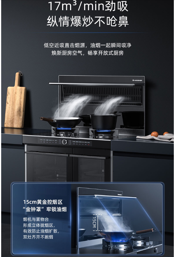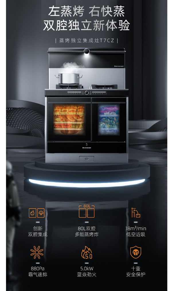这款集成灶有17立方米/分钟的排风量加上880Pa的强劲电机,而且还是低空吸净烟源,吸收油烟能力非常出色,再也不用担心油烟的问题了。此款集成灶的最大火力可达到5.0KW,无论你想要的小火慢炖还是大火爆炒,这款集成灶都能很好的满足你的需求!台下的蒸烤箱有45L的大容量,满足各种家庭宴会需求,还能一箱多用,既能补水蒸汽烤,又有高温蒸的功能,还可代替空气炸锅烹炸食品,一机三用!外观高端大气,宽大置物台满足多种放置物品的需求。