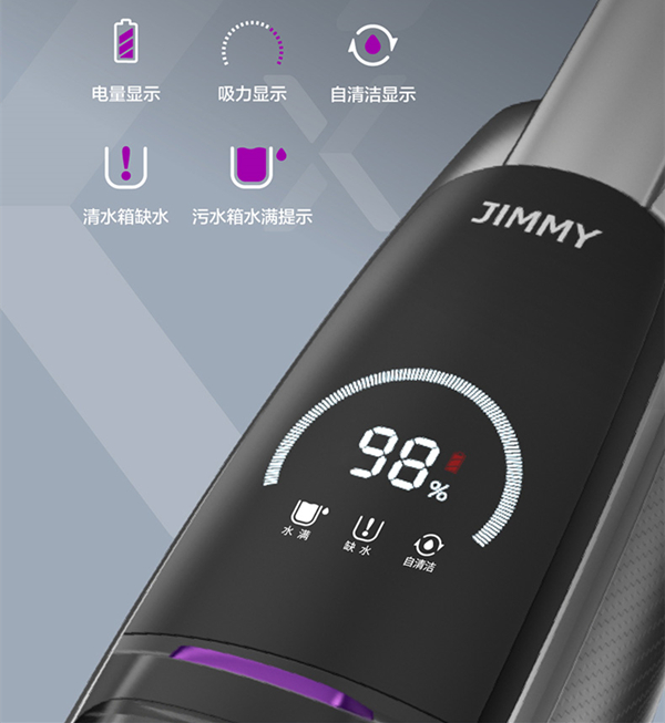 吉米X8速干洗地机配备了一块超大的LED显示屏,可以实时显示剩余电量百分比,吸力的大小,并且会提示自清洁显示,水箱缺水、污水箱水满等状态。我们在日常使用的过程中,可以通过显示屏显示的内容来知道目前机器所在的工作状态。