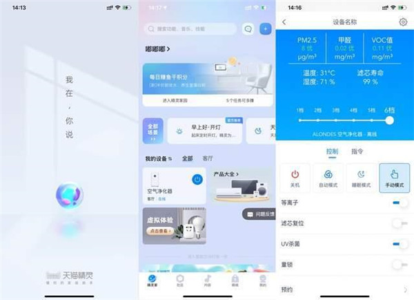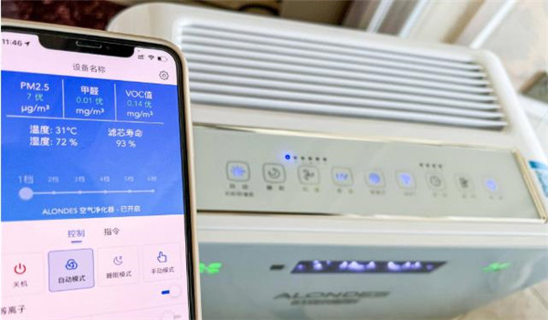 作为一款新时代的民用家电,所以智能化是必不可少的,这款欧朗德斯A5s空气净化器也是一样支持和手机App连接,并且可以扫机身的二维码连接家里的WIFI。可以下载一个天猫精灵软件,配对后家里有天猫精灵的就可以用语音控制空气净化器了,也可以直接在手机上控制这台空气净化器的功能开关,也可以看到一些数值,这点还是比较直观的。>连接也比较简单,扫码连接WIFI,然后按提示操作就可以。绑定后就可以在App的主页面上看到这款产品,并可以通过手机App来实现远程控制了。操作界面并不是很复杂,上面显示着当前室内的各项空气指数,也可以直接在App上实现更方便的控制,同时支持实用的预约功能。