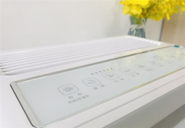 顶部有一排功能展示,很丰富,有自动、童锁、睡眠、风速、UV杀菌、等离子、WIFI、定时、滤网更换提醒、电源开关。很多空净品牌都没有做数显,即使有少数有做也只是显示了很少的几个数值。这款A5s可以显示 五种数值,非常全面。数值显示器旁边的两朵小花会根据家里空气质量显示不同的颜色。空气质量好显示绿色,空气质量差会变成黄色,空气污染严重会显示红色。两朵小花显示的是:指示灯左边是PM.25 ,右指示灯TVOC,甲醛 。
