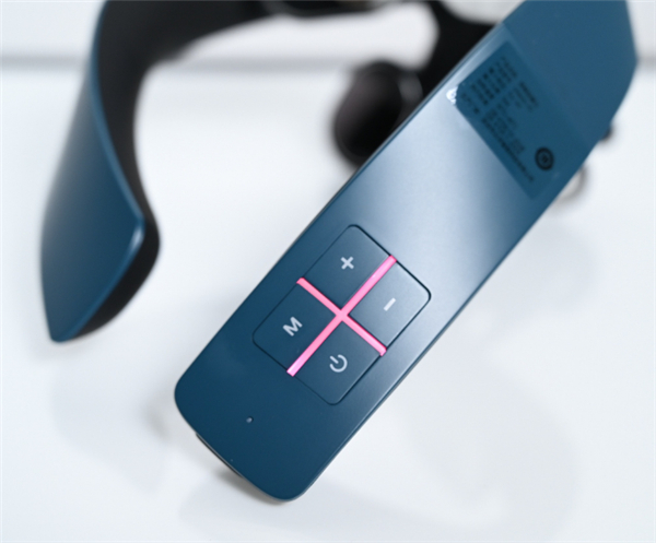 在宾多康智能颈椎按摩仪的左边外侧,有用来操作的按键,上面可以开关机、设置模式和按摩力度,用起来非常简单,开机时还会有彩色LED灯,操作起来非常直观,而且比较顺手。
