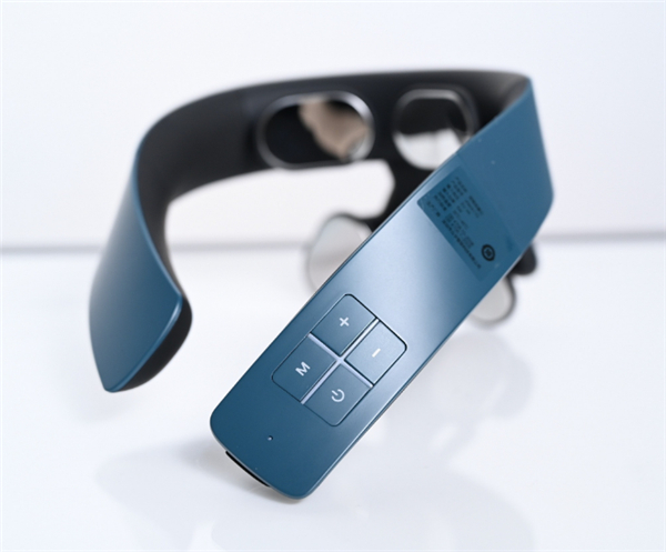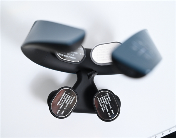 在材质上,这款按摩仪两侧支架外侧是硅胶材质的,表面有一定磨砂质感,戴上之后感觉比较舒服,没有什么异物感,而且按摩仪比较轻巧,本身只有205克左右的重量,其贴合皮肤的按摩头触感也很不错,在使用之前记得把按摩头表面的保护膜摘下来。