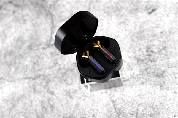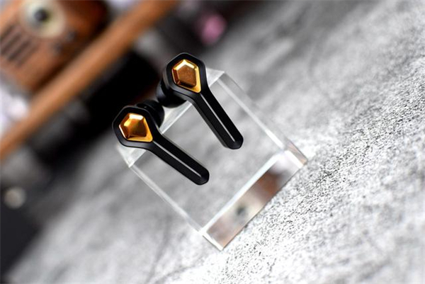 充电仓的外形别具一格,六边形黑色磨砂质感,顶盖的金色线条点缀得恰到好处。据官方说这个延续RS系列家族化设计,代表一个圆滑和棱角的折中。