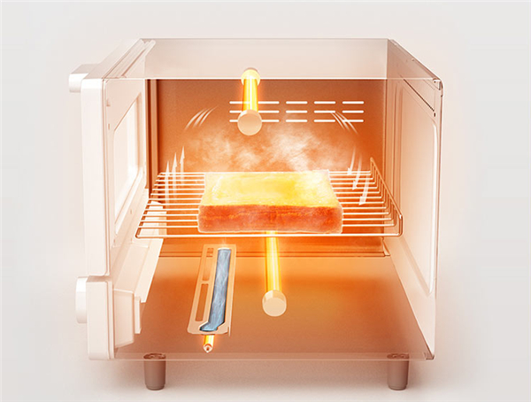 打开烤箱门,可以看到烤箱内部是采用镀锌板+镀铝板设计,这样的好处是烤箱内食物受热均衡。在米家智能蒸汽小烤箱上、下各配置了一根石英加热管,功率高达1300W,升温速度是普通32L烤箱的两倍多。每天做早餐,无需预热,直接把面包、蛋挞放进去,不到10秒温度就上来了。
