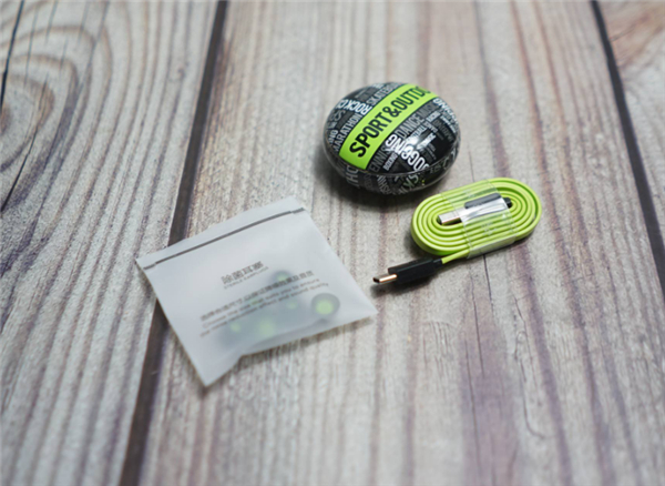 充电线采用了嫩绿色非常的富有活力,充电线采用了目前主流的type c接口,附赠了4套不同规格的耳塞套可以适应不同耳道大小的用户进行选择。