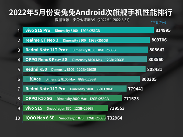 5月Android次旗舰手机性能榜:天玑8100占领榜单