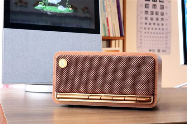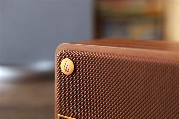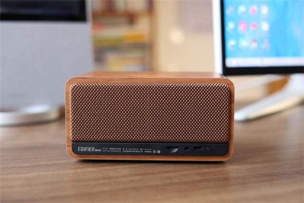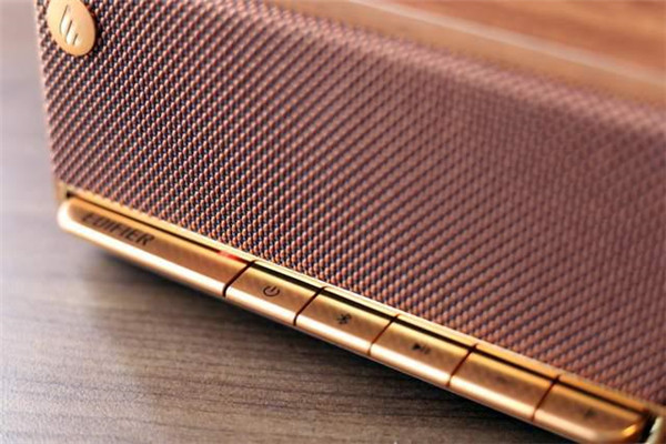 漫步者M230蓝牙音箱是木质胡桃色,木质的纹理更增添了复古风尚,音箱是方方正正的设计,不过小巧的音箱边缘都作了圆角弧形处理,正面是凸出的部分音腔,表面是一层棕色与黑色相交织的编织线作为装饰,很不错。
