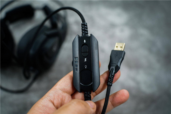 而线控这里,带有麦克风开关和灯效开关,侧面这里,还带有音量音质,采用滚轮设计,玩游戏的时候,用这个控制音量特有感觉,而且还很方便,往上提高音量,往下降低音量。