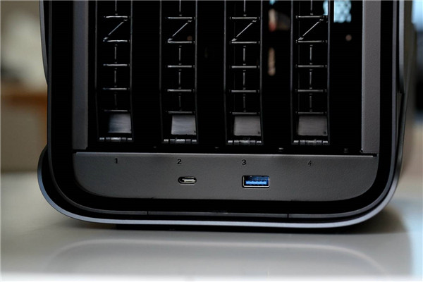 取下面板之后,就可以看到硬盘位下方还设有1个Type-C接口和1个USB 3.2接口,可直接插上U盘或者移动硬盘进行读取、拷贝,传输速度也是非常快的。