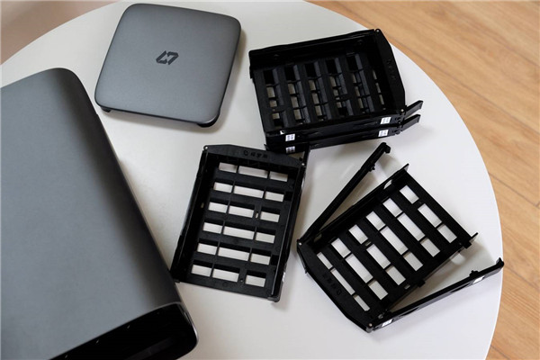 硬盘支架都是ABS塑料材质,采用悬浮式全镂空设计,拉出或推入都比较简单,上面设有硅胶扣和静音垫,不需螺丝钉就能可以轻松安装3.5英寸硬盘,而2.5英寸硬盘的话则需要底部用螺丝钉锁牢固定。