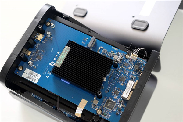 蓝色的主板看上去做工很不错,正中间黑色的是它的散热片,尺寸不小哦,而散热片下面就是最新一代Inter J4125四核处理器了。极空间新Z4配备了8GB RAM,虽然不支持内存扩展,但是8GB RAM已经很够用了,即使想玩玩虚拟机也绰绰有余。