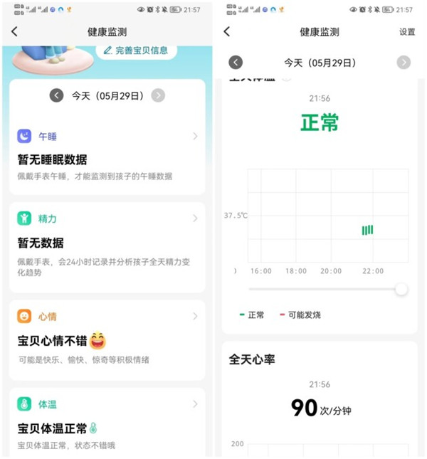 为了让体积小巧的电话手表发挥出更多作用,小天才Z8还具备健康监测功能,孩子午睡、精力、BMI、心率、体温、心情等都能进行监测,所有数据家长随时都能查看。如果相关数据出现异常,也会第一时间通过家长端APP进行告知,帮助家长及时掌握孩子的身心健康信息,家长打开往日的健康数据时,还能简单追踪孩子过去的身体状况。