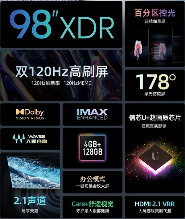除了巨幕之外,海信ULED电视98U7G-PRO的性能表现更已站在塔尖,120Hz高刷新率带来丝滑流畅视觉效果,178°超广可视角度,海信信芯U+超画质芯片,支持杜比全景声+杜比视界,以及IMAX ENHANCED认证,HDMI2.1接口增强拓展性,4GB+128GB的规格保证长时间运行仍然流畅不卡顿。