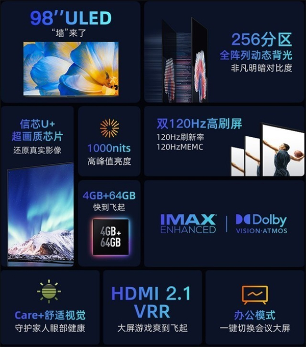 这是一款拥有98英寸超大屏幕的ULED平板电视,集合了海信几乎所有的技术储备,是当之无愧的旗舰机型。首先巨大的尺寸能够塑造无与伦比的视觉沉浸空间,98英寸已接近屏显产品的尺寸天花板,无论您在什么样的空间观看,震撼感知都会跨越式碾压目前主流55、65英寸产品。