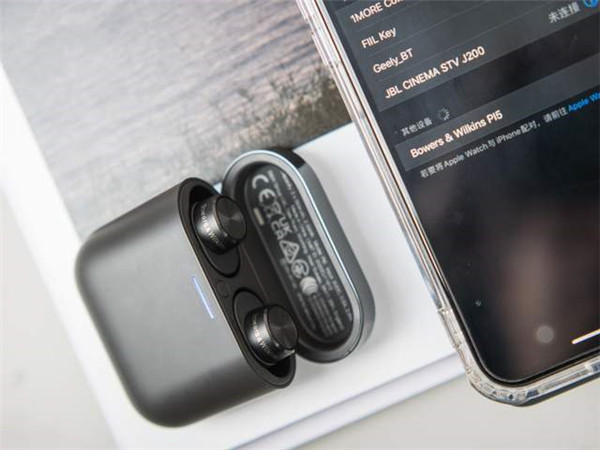 宝华韦健PI5的充电仓设计是比较低调内敛的。它使用了磨砂与亮面拼接撞色的设计,看上去沉稳大气,同时盒盖顶部的“Bowers&Wilkins”字样彰显着它的身份。