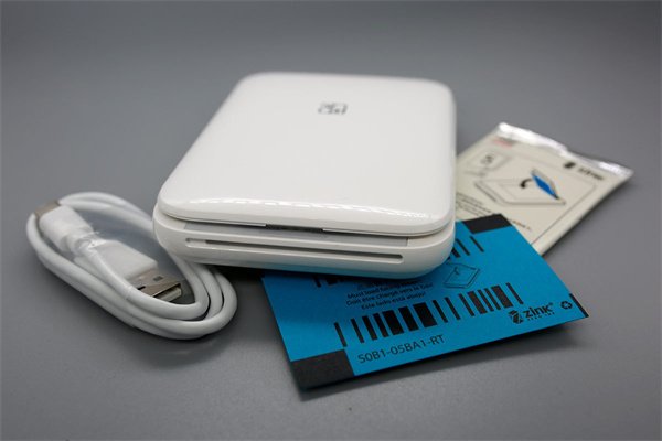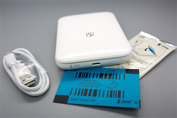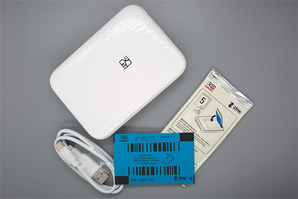 在配件方面,包含:主机、三份打印纸、一条Type-C充电线和使用说明书。特别注意的是打印纸为专门用来打印彩色的采用了Zink(“Zero Ink”的缩写)技术的相纸,使得照片打印尺寸可以做得很小,其不使用墨水和墨粉的特性,避免了弄脏衣物和随身物品。