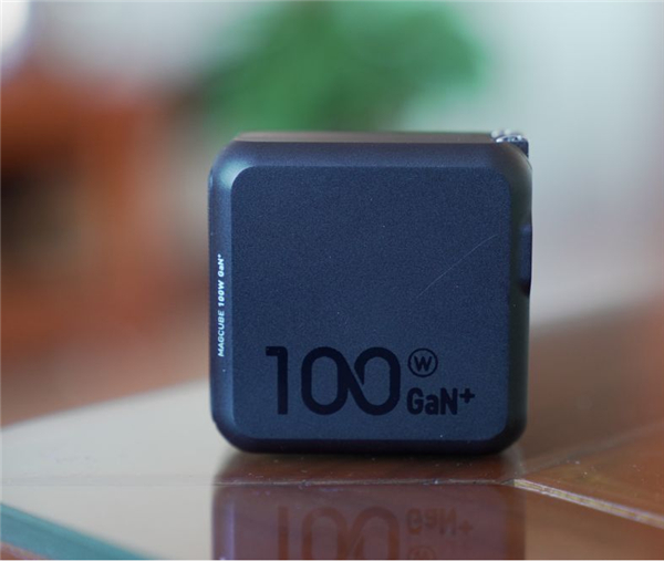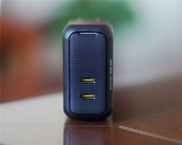双插口的一侧有“PD”标识,另一侧则有“MAGCUBE 100W GaN+”的字样。